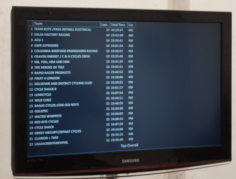Results tend to take a while to come out, below is a photo of the overall results screen from the finish.