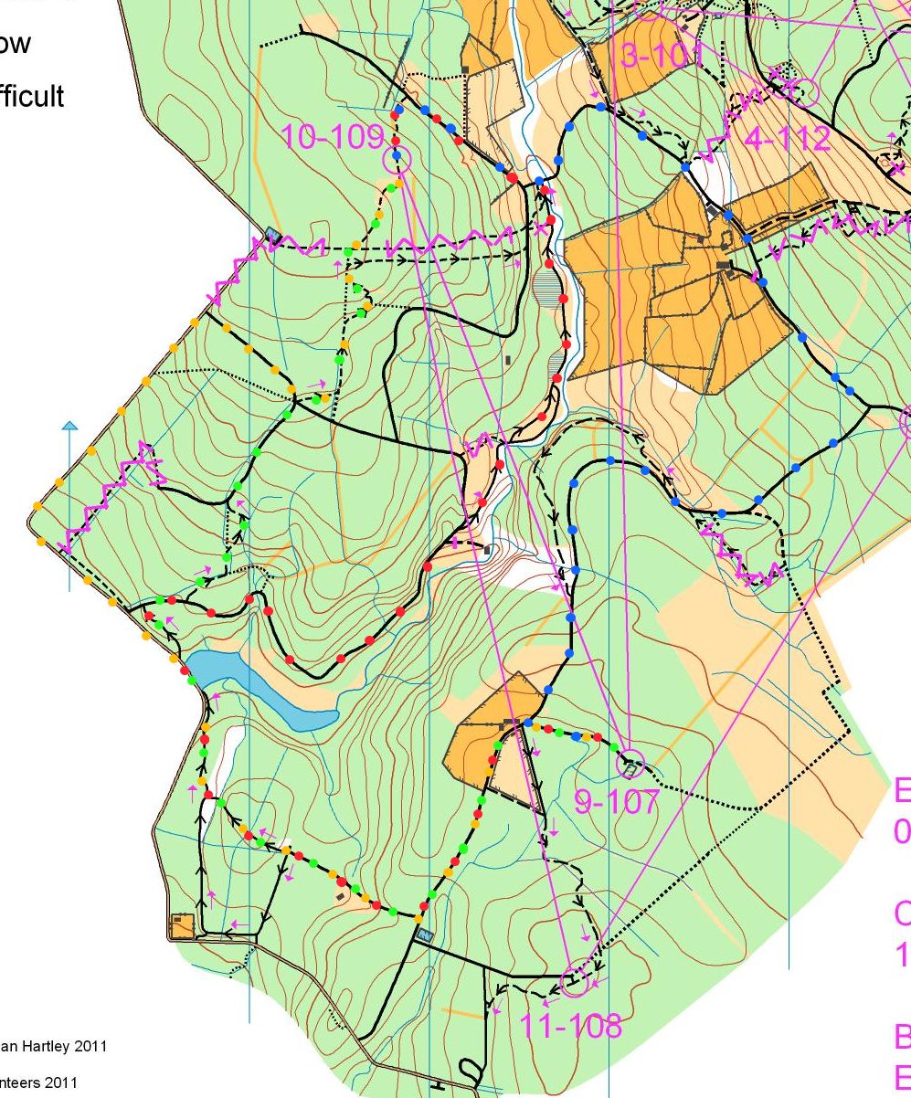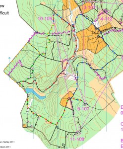 Because of the all the one way trails it does make 9-10 and 10-11 completely different legs, and certainly the best way to 11 is round the north back along the blue route, but because 11 is south of 9 it did make a few riders go round to the south to 11. The original A legs were actually the other way around, so from 11 to 10 then back to 9, then it is a better leg on the way out, but then there was no real choice on the return. It’s actually a real pain trying to put long route choice legs in with so much one-way, I was originally trying to get a leg back to the SW corner to then go direct to finish from there, setting up a great “run-in” route choice of north or south, but you can’t have a leg of any interest against the singletrack without tempting cheating.