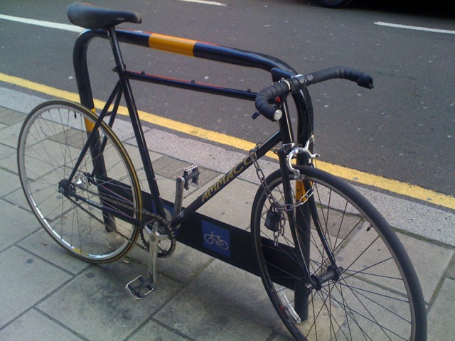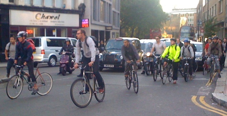 I spent today at Pozzoni’s London office before travelling to Italy for the MTBO World Cup. Being such a lovely evening (and with some time on my hands), I decided to walk back from the office on Old Street in Clerkenwell towards the station. Walking up Clerkenwell Road I was taken aback by the sheer number of cyclists. Streaming away from the traffic lights, where many had stood track-standing their fixies, there were simply more bikes than cars. As I continued to walk, the mini pelotons of commuters did not diminish. There were lots and lots of fixies and not just the previous trend for old hacks. There were some gorgeous bikes going past with striking colour schemes, tiny narrow bars and the ubiquitous single brake lever. Certainly, along Clerkenwell Road there were a lot of very cool people riding bikes that said, “Look at me,” with individuality being the trend.