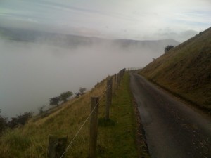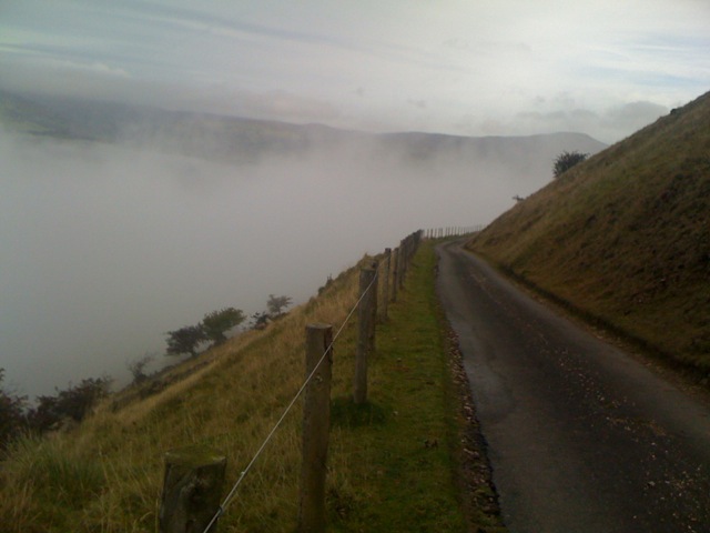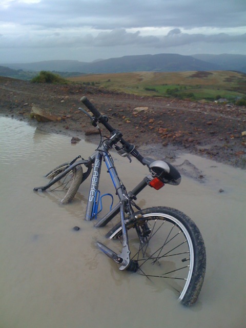 By the time I got off the road and on to the hill, the rain had ceased and I was treated to a great ride on the edge of the Blorenge, a steep drop below, ducking in and out of the cloud-base, sneaking fantastic views to the north. I then descended down some rocky single-tracks, now boiling streams before climbing back over Coed Y Prior via a scary greasy narrow road descent down onto the cycle path for a blast for home and a hot shower.