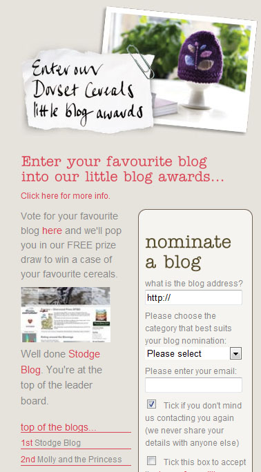 After the midnight reset of Vote numbers, stodge-blog votes have continued to come in for next months prize but there is no mention on the site of Novembers winners. So stodge-blog is now leading Decembers little blog awards with a great link on the front page of the Dorset Cereals site. I assume that it was won by Molly and the Princess (which is a Pashley Princess Bike), congratulations to her.