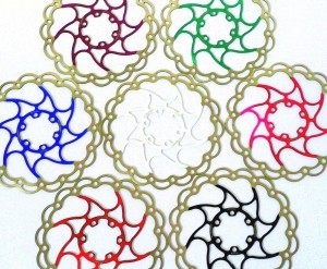 My new lightweight brake rotors have arrived from the XC Racer shop. Unfortunately, they didn’t have any plain silver ones in stock so I was persuadedby its owner, MTB endurance legend Ant White, to go with a bit of bling! Although they have all sorts of colours, I went for white to match my frame. These Alligator rotors are feather light at 76 grams for the 160mm and 96 grams for the 180mm, saving me 80 grams in the most important area, the rotating mass. They come with a set of bolts and nicely protected on a cardboard backing.