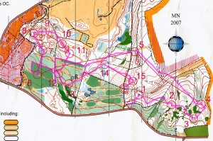 I started well and ran the first 5 cleanly losing no time and picking good lines through the terrain. However I completely fluffed 6, confused by the contours hidden under the no.12 lettering and thought (though unconvinced at the time) I had overshot. I backtracked and took the wrong earth wall only to find Iain’s decoy control in a parallel position on the earth wall. I knew I was wrong and immediately started relocation by running straight through to see where I would come out. Noticing the marshy scattered trees 20 secs later I knew where I was and re attacked the control successfully on the correct earthbank. I then, other than a 10 sec wobble on 12, ran the rest cleanly, finishing in 27 mins for the 3.6km.