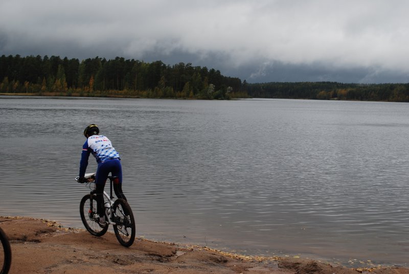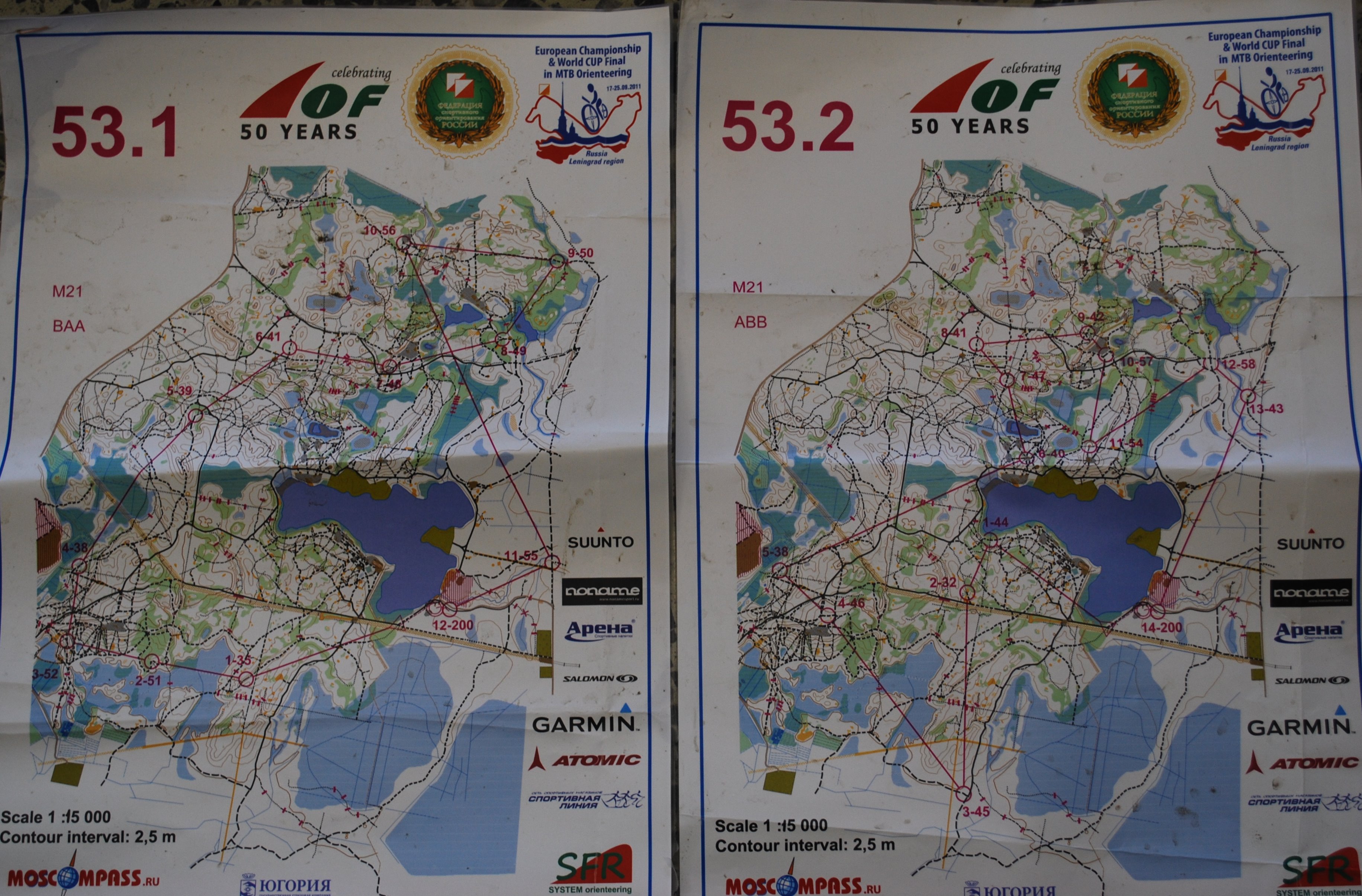 65 men lined up 3 to 4 abreast on a fire track with our maps suspended over us, Tio Mila style. We had 1 minute with the maps before the gun, and I spent all of this minute folding both of them really carefully so that I wouldn’t need to refold at all and so that at the end of the first loop I’d simply have to swap them over. The pace was frantic from the start , I overtook a few people and got into the middle of the pack as the gaffle (fork) I had piled off left towards number one. I was riding well, and keeping a close eye on the map, using the riders ahead to see where possible shortcuts through the forest would bring me up the field. There were lots of roots and the going was treacherous, sending many riders over the handlebars. The second forking really caught some people out, piling straight on following others. I got a good route choice, however, and from the lack of tyre tracks was in second place on that fork. Then came disaster on the way to the next. I made a mistake missing a junction and relocated with compass only when I saw the road coming up. I took advantage of the speed of the road and rejoined the group, except at the back of it, losing probably 2-3 minutes. I worked my way forward again through numbers 7-9 chuckling to myself at the curses people were shouting as they struggled with mistakes and drive train woes, chain suck seeming to be a real problem. I think I now know how to swear in Estonian and Russian. 9 to 10 took us through