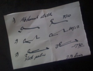 So I’ve been down to Taunton twice in the last two weeks. Ivor uses a range of treatments from chiropractic to electro, laser to acupuncture, depending on what’s needed and has also given me lots of exercises to be getting on with. His exercise diagrams are elegantly simple, drawn with a posh ink pen.
