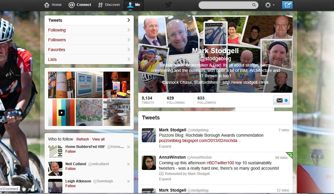I started tweeting a little when I was trying to win a Dorset Cereals little blog award a few years ago campaigning for votes. I then realised other than Ada Timmis I didn’t know anyone on Twitter, wasn’t interested in what celebs said, didn’t have much to say other tha tweeting my blog posts and left it for a while. Then I realised that twitter was THE place to network and find out the latest in one of my fields of work – Building Information Modelling – BIM. This Buzz word in the construction industry at the moment is scaring lots of people silly because the government has mandated it use from 2016 on all public projects and take up is generally poor in the industry.