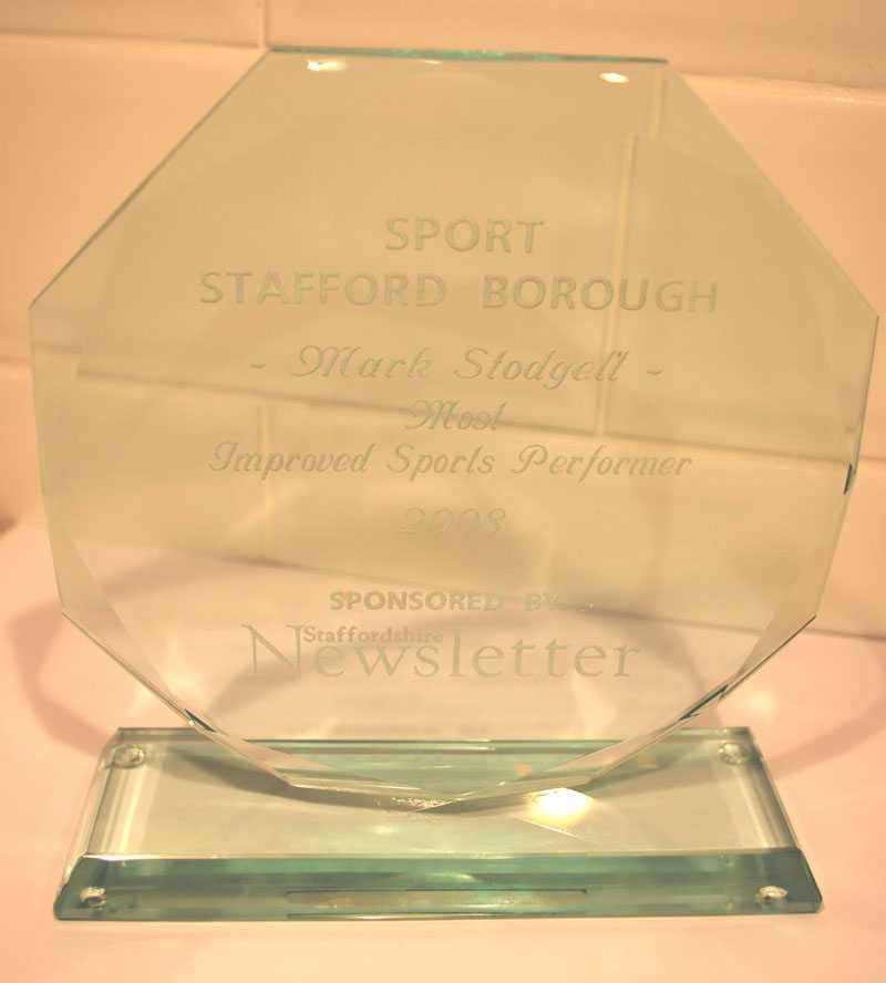A very happy Stodge has just returned from this years Sports Stafford Borough Awards with a nice shiny trophy for most improved sports performer !